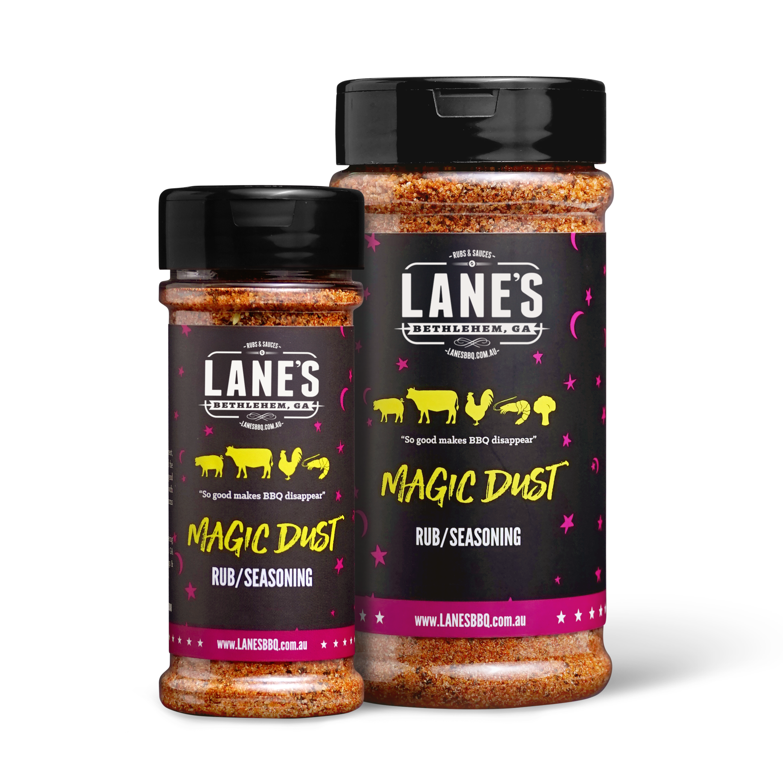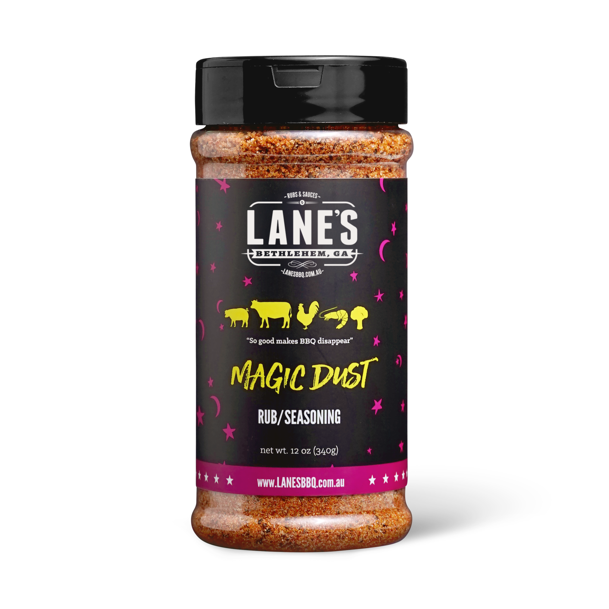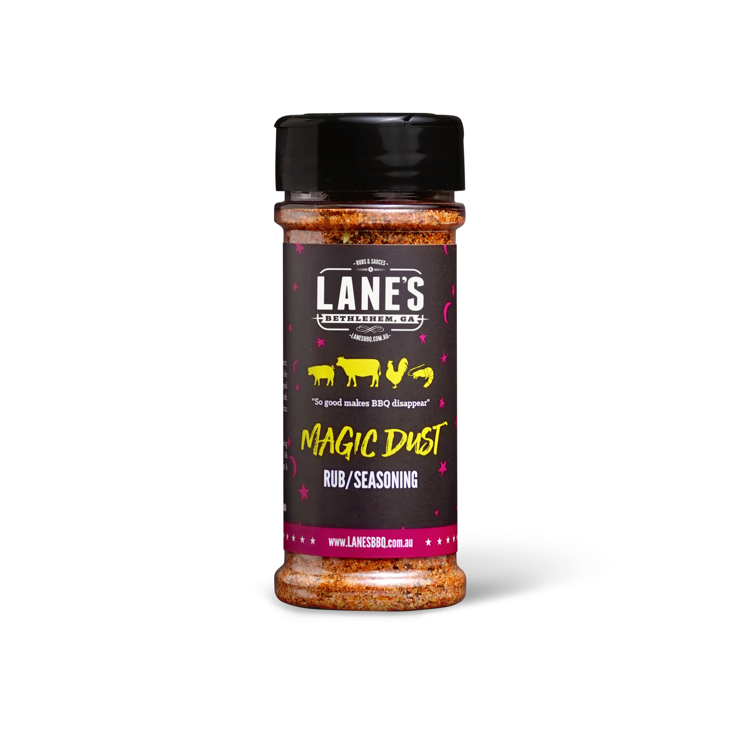 Meet Lane's Magic Dust - the only seasoning you'll ever need! This award-winning, slightly sweet, all-purpose BBQ rub presents a tantalising mix of sweet, salty, and smoky flavours, destined to become the crowd-pleaser at every meal. Born out of an experiment, Magic Dust quickly won over the pit-masters at Lane's BBQ and continues to charm palates across Australia, even bagging the title of Australia's Best Pork Rub at the Australian Barbecue Alliance Awards 2022/2023.