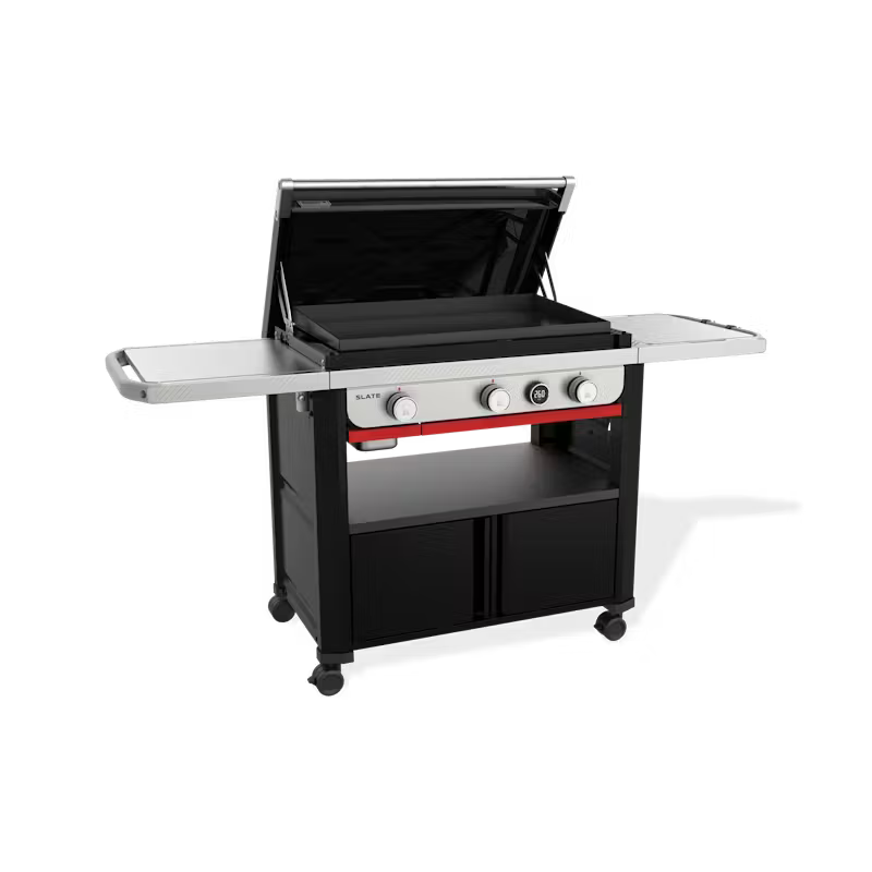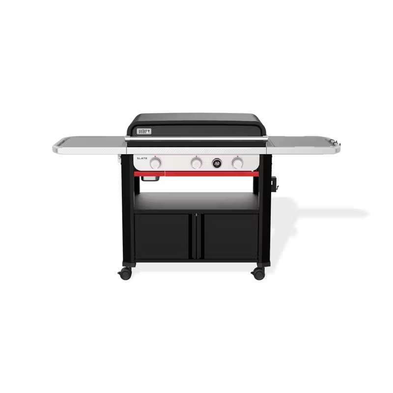Have more fun griddling on the 30” (76 cm) rust-resistant Weber® Slate™ 3 Burner Premium Griddle BBQ that’s ready to cook on right out of the box. It reaches over 260°C and heats evenly edge-to-edge, so your food cooks consistently no matter where you place it on the griddle. The average griddle surface temperature is shown on the Digital Read Out display. Plus, with the Weber Works™ Prep, Cook, and Store System you can keep cooking and cleaning supplies handy, carry food and condiments from the kitchen to the griddle, convert the side table into a prep station and stow gear in tightly sealed containers.